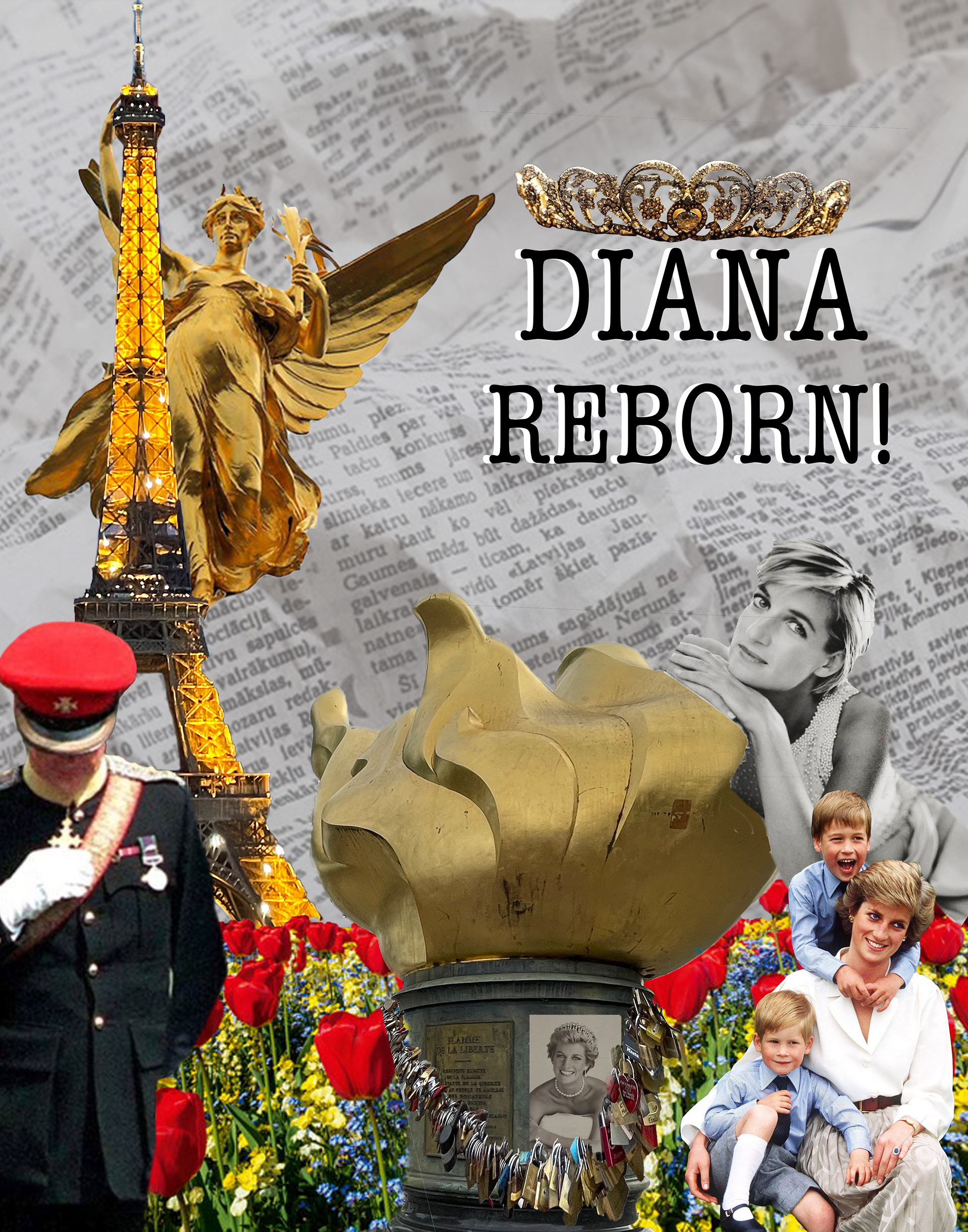 This piece is a portrait collage in honor of Princess Diana Spencer who was known as the People’s Princess. She lived a very difficult life when she was married to Prince Charles. The collage symbolizes how she was reborn after she left him with the burden of the crown lifted from her. The newspapers reflected a key component in her life, the paparazzi which eventually killed her. The center of the photograph is from a picture I took in Paris at the location where she passed away. The monument is the flame of liberty which symbolizes her freedom as well as the passion she had for her children and everyone who she served. When she died, she became free from the burden of the paparazzi and the newspapers which never gave her any freedom or peace. I used Adobe Photoshop and photography for this project.
